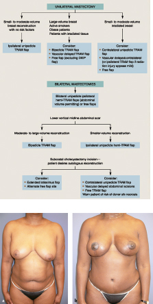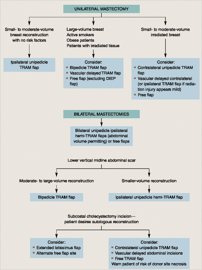 In principle, the higher the patient’s risk, the greater the likelihood that she will require a bipedicle vascular delayed procedure. For the nonmicrosurgeon, this is certainly the case and provides a safe alternative to a complex microsurgical procedure with which he or she might not be comfortable. A surgeon familiar with unipedicle and bipedicle procedures will be able to offer the TRAM flap to a large number of patients with a wide variety of clinical problems. Many patients who are unsuited to this procedure because of associated risk factors are often candidates for latissimus dorsi flaps.