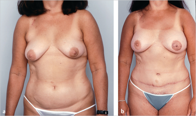 This patient presented having previously had expanded implant reconstruction followed by radiation therapy. She had significant radiation fibrosis with asymmetry. A pedicled TRAM flap salvage procedure was planned. She had a well-developed lower abdominal pannus as a donor site. Her radiated skin was excised and replaced with soft abdominal skin providing better ptosis. She is shown 1 year after reconstruction with a successful outcome in much better shape and symmetry (▶Fig. 51.3).