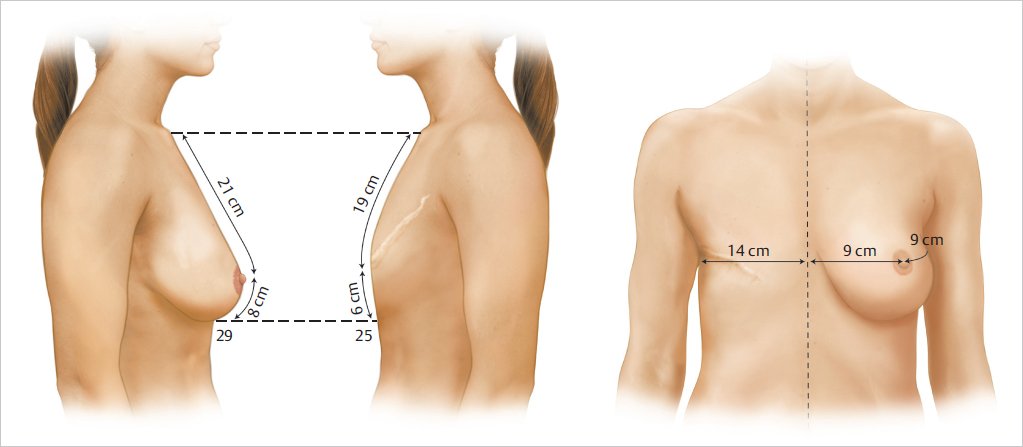 The amount of subcutaneous tissue and skin necessary for final symmetry, axillary, and infraclavicular fill, and breast mound restoration must be determined. Patients with a modified radical mastectomy deformity usually do not need fill for the infraclavicular area unless pectoralis major muscle denervation or significant excision of infraclavicular tissue has created a tissue deficiency.