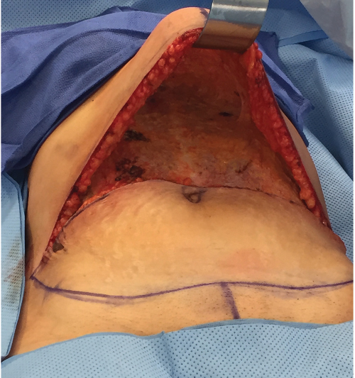 Preoperative markings to identify tissue deficiency as well as the amount of available lower abdominal tissue.