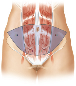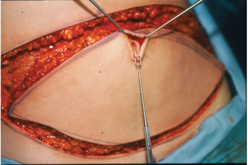 Tight closure can seriously compromise blood flow to the skin edges, causing skin necrosis. Obese patients are particularly at risk of tension-induced necrosis. The Pfannenstiel incisions are routinely ignored. If they happen to fall into the planned lower incision line, I incorporate them, but if they are too low, I simply ignore them. I have never seen the intervening skin between a Pfannenstiel incision and the TRAM donor site closure undergo necrosis. The distal incision is made, and the TRAM flap can be elevated (▶Fig. 51.22).