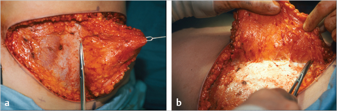 Whichever side is selected, the dissection from the nonpedicle side is then carried across the midline to the medial row of perforators on the pedicle side. This leaves the flap attached only by the perforator rows and a narrow band of fat (▶Fig. 51.27).