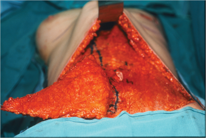 If the patient is having an immediate reconstruction, in our practice she has usually had a skin-sparing procedure. I evaluate the defect and inspect the bed of the wound to ensure that hemostasis is secure before proceeding with TRAM flap elevation. I also assess the thickness and color of the skin flaps to determine the likelihood of having to resect poorly vascularized tissue in an effort to avoid wound healing problems. If the procedure is delayed, the mastectomy scar is excised and the upper and lower mastectomy flaps are raised off the underlying pectoralis major muscle to create an appropriately sized recipient bed for the flap. I routinely submit the mastectomy scar for pathologic evaluation, although recent data suggest that the likelihood of microscopic recurrence within the scar is less than 1%. In delayed reconstruction I usually resect the entire lower pole mastectomy skin to allow the soft fullness of the TRAM flap to become the new lower pole and inframammary fold.