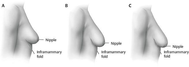 Surgical planning depends on relative locations of nipple and inframammary fold (IMF) (i.e., ptosis). Regnault described three categories67 (Fig. 54-1):
