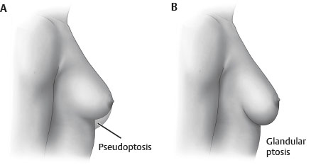 Pseudoptosis: Nipple at or above IMF but breast parenchyma below IMF 8 (Fig. 54-2, A)