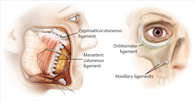 • Palpate for the zygomaticocutaneous, orbital, maxillary, and masseteric retaining ligaments and assess any weakening connections that affect the ligaments’ ability to restrain facial skin against gravitational effects. The zygomaticocutaneous ligament originates from the inferior aspect of the zygomatic arch and expands anteriorly toward the junction between the zygomatic body and arch. The orbital retaining ligament extends along the orbital aperture and terminates where the lateral orbit thickens. The maxillary retaining ligaments are superficial to the maxilla, originating from the masseteric fascia and lying on top of the masseter muscle.