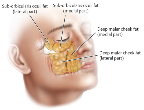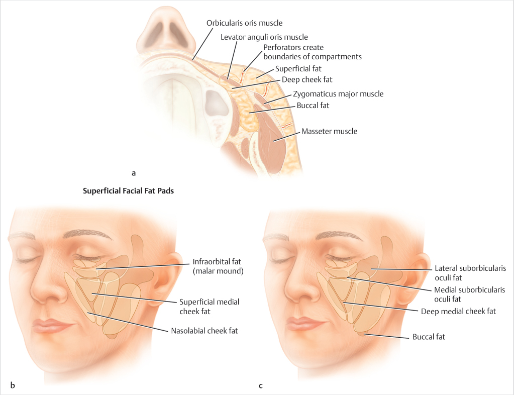 • There are superficial and deep fat compartments within the midface that all contribute to malar soft tissue complex descent and lead to distinct morphological changes associated with facial aging such as volume depletion (Fig. 55B.2a–c). The three superficial facial fat compartments are the nasolabial, infraorbital, and superficial medial cheek fat pads. Deep fat regions include the medial and lateral SOOF, buccal, and deep medial cheek fat pads (as described by Wan, Amirlak, Rohrich, and Davis in The Clinical Importance of the Fat Compartments in Midfacial Aging).