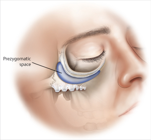 • The premaxillary space should also be analyzed for hollowness. This space expands beneath the posterior capsule of the orbicularis oculi muscle. Great caution should be taken when injecting into this area, as the infraorbital neurovascular bundle lies deep to this space near the anterior surface of the levator labii superioris, and the angular vein courses laterally through the border of this space.