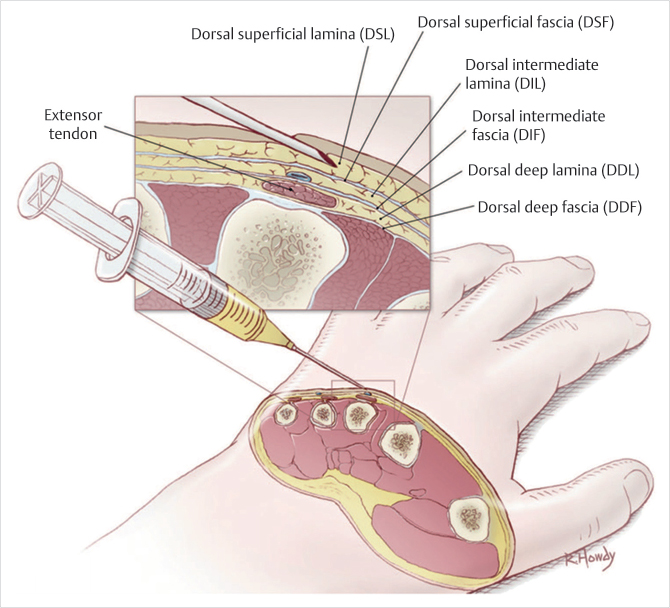 Bidic et al described the anatomy of the hand in distinct layers transitioning from superficial to deep: skin, dorsal superficial lamina, dorsal superficial fascia, dorsal intermediate lamina, dorsal intermediate fascia, dorsal deep lamina, and dorsal deep fascia.