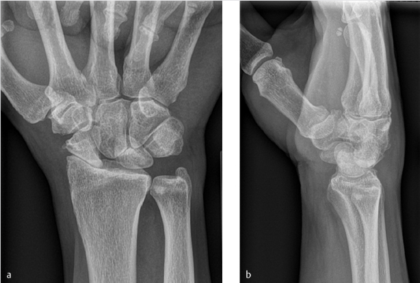 Plain radiographs: PA, lateral, ulnar deviation, and clenched fist views are usually sufficient for diagnosis and may reveal excessive flexion of scaphoid, scapholunate widening, and radiocarpal and/or midcarpal arthritis (► Fig. 59.1). We often obtain views of the contralateral wrist for comparison. When the condition of the radiolunate joint is unclear, magnetic resonance imaging (MRI), computed tomography (CT), or diagnostic wrist arthroscopy can be helpful.