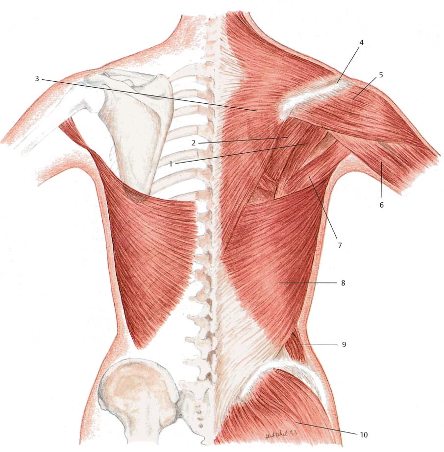 The latissimus dorsi is a large, triangular muscle that fans out over the back. It arises from the spinous processes of the lower six thoracic and the five lumbar vertebrae, the sacrum, and the posterior iliac crest. Some fibers also originate from the lower three or four ribs and sometimes from the inferior angle of the scapula. At the level of the inferior angle of the scapula, the muscle fibers converge toward the axilla, where they are in close contact with the teres major and thus contribute to the posterior axillary fold. The latissimus dorsi then rotates laterally and anteriorly around the teres major toward its insertion. Its tendon, which is 3 cm wide, inserts on the floor of the bicipital groove of the humerus. The teres major is the main muscular component in the posterior axillary fold, and the fold is therefore largely preserved if the latissimus dorsi is transposed anteriorly ( Figs. 6.10, 6.11 ).