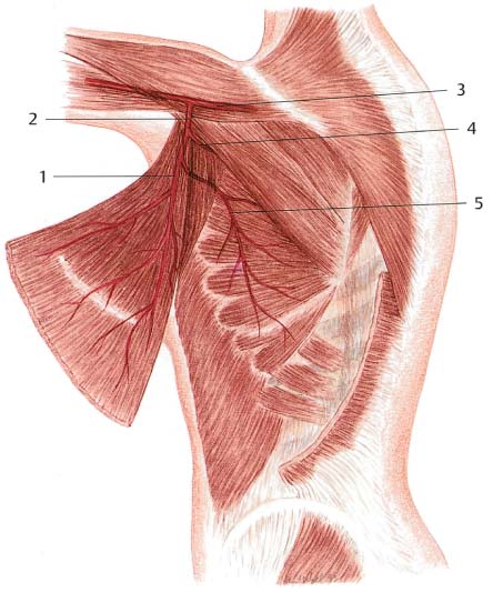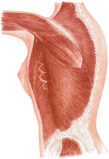 If the normal blood supply to the latissimus dorsi is disrupted due to transection of the thoracodorsal artery, the muscle is supplied by the serratus branch, which is fed by intercostal arteries and collateral vessels of the serratus muscle. This situation is not optimal, but the supply is sufficient for the myocutaneous flap. The thoracodorsal artery and serratus vessels are normally preserved when the latissimus dorsi is used for breast reconstruction. The muscle can be rotated around its neurovascular bundle in the posterior axillary fold and positioned on the anterior chest wall.