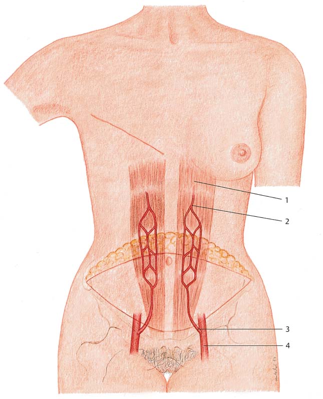 In addition to the deep arterial system, the lower abdominal skin flap is also supplied by the superficial inferior epigastric artery (SIEA) and respective veins. Isolation of a flap around these vessels, which are branches of the great pelvic vessels, is also an option.