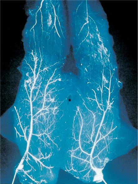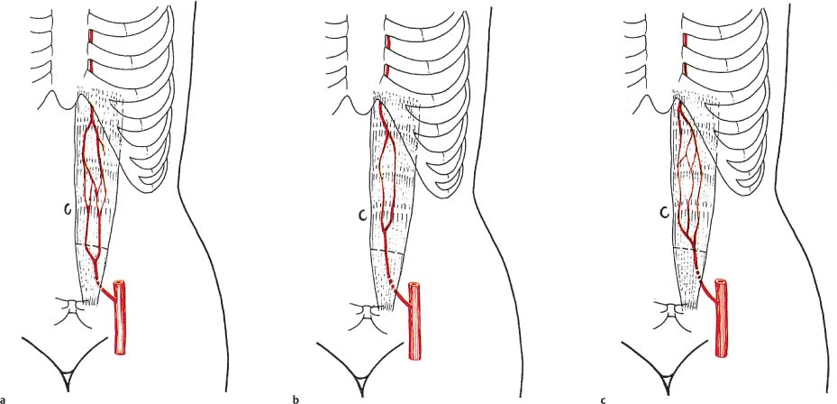 Experienced surgeons in particular tend to want to use a muscle-sparing procedure along the lateral muscle border to preserve the integrity of the abdominal wall. For anatomical reasons, this is not advisable, however. As the arteriography image in Fig. 6.26 demonstrates, the anastomotic networks are especially well developed in the lateral portion of the muscle. As the veins follow the course of the arteries, such a procedure would fail to include important flap drainage systems. To improve flap rotation, the muscle pedicle can be narrower at the costal arch, as the vessels from the anastomotic network rejoin here to form larger-caliber vessels.