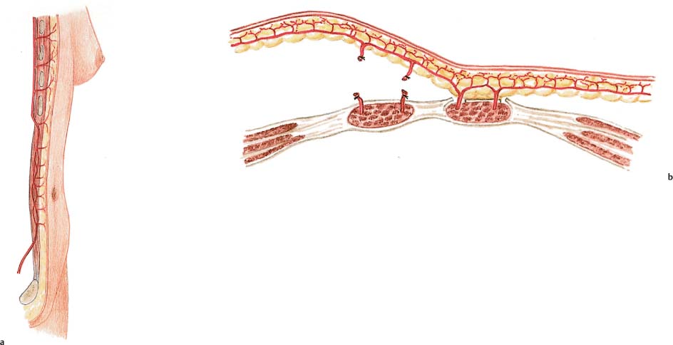 For perforator dissection, it is important to identify the largest perforators. On the other hand, it is also preferable for dissection to extend over only a short distance. A dissection study by Munoz showed that the lateral perforating vessels are short and pass in a straight line through the muscle in nearly 80 % of patients. The medial perforators are larger in caliber, but in 80 % of patients have a longer intramuscular course. This prolongs the time needed for dissection and increases muscle trauma. There are significantly fewer lateral perforators (34 %) than medial perforators (66 %); Blondeel has also reported similar findings. Isolation of the flap on a lateral perforator is preferable, for shorter and atraumatic dissection. Preoperative Doppler examination and intraoperative assessment are essential for choosing the most suitable perforator or perforators.