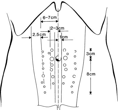 Correct drawing of the flap requires some experience. Sufficient tissue has to be obtained while avoiding tension along the wound margins, which would interfere with healing and the formation of a symmetrical scar. With the patient sitting and then standing, a pinch test is carried out to determine the amount of excess tissue on the upper and lower abdomen. Taking into account the periumbilical location of the perforators, the superior limit of the flap should be above the umbilicus (or at least at the same level). Any adjustments in flap length can thus only be made by altering the inferior border. In patients with a firm abdominal wall, a shorter flap length will have to be acceptable; in patients with looser abdominal skin, a more generously proportioned flap is possible.