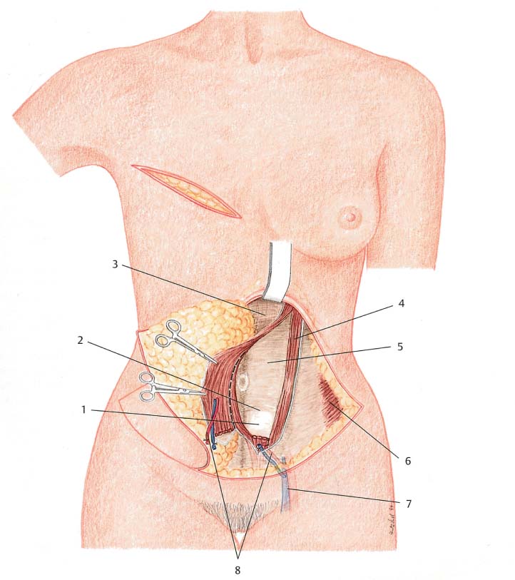 Flap harvesting starts with dissection of the nonpedicled side of the flap to beyond the midline. One can already obtain a rough idea of the position and number of perforators in the pedicled portion of the flap, although absolute symmetry is rare. Dissection of the medial border of the fascia is often carried too far medially, with the fascial incision being nearly at the midline. This can occur particularly in patients with diastasis recti. A safe and reliable method is to carry the dissection to 1.0–1.5 cm medial to the midline. This spares a few centimeters of valuable fascia and allows reliable abdominal closure.