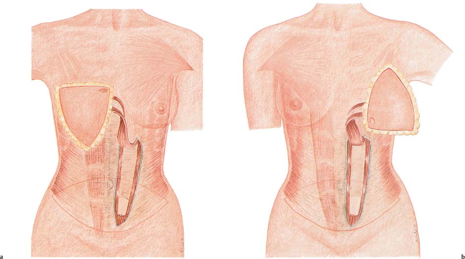With continuing dissection in the subcutaneous plane, the breast skin is completely freed off the pectoralis muscle along the preoperative markings, which have been drawn to match the boundaries of the contralateral breast. Dissection proceeds to 2 cm superior to the inframammary fold that has been marked, and it should be remembered that the wound margin will later descend with abdominal wound closure. Excessively wide dissection, beyond the anterior axillary line, has not proved useful, as it often produces exaggerated lateralization of the flap. This is a common risk, given that the postmastectomy scar extends far into the axilla. If the entire scar is excised, the axillary region is opened too widely. Surgeons often mistakenly believe that the breast can be restored to its original form by excising the mastectomy scar and dissecting the previous breast skin. This fails to take into account postoperative skin shrinkage, which completely alters the anatomical conditions. For tension-free placement of the abdominal flap and reconstruction of the breast as an aesthetic unit, it is absolutely imperative to preserve the anterior axillary line and excise the breast skin. It is only by doing this that a good aesthetic outcome can be achieved. Unfortunately, this also entails the risk that primary wound closure will be very difficult in cases of partial or complete flap necrosis.