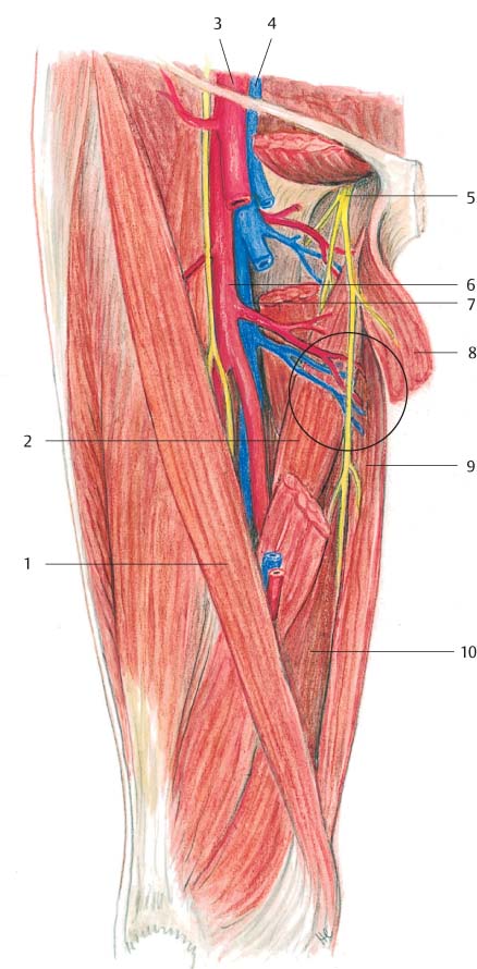 The gracilis muscle originates at the inferior pubic ramus and radiates with its typical round tendon into the common tendon of the pes anserinus, inserting along with the semitendinosus and sartorius muscles at the tibial tubercle ( Fig. 6.60 ). It is regarded as a type II muscle flap, with a single dominant proximal vascular pedicle and with one or two additional minor, more distally located pedicles. The main vessel (the terminal branch of the medial circumflex femoral artery, or a more distally coursing parallel vessel) arises from the deep femoral artery and vein. The origin of the flap artery can be located immediately lateral to the adductor longus muscle. After giving off several large branches into the adductor longus and smaller ones into the adductor magnus muscle, the artery enters the gracilis muscle approximately 8 cm inferior to the pubic tubercle. The nerve—the anterior branch of the obturator nerve—is located approximately 2 cm cranial from the point at which the vessel enters the muscle.