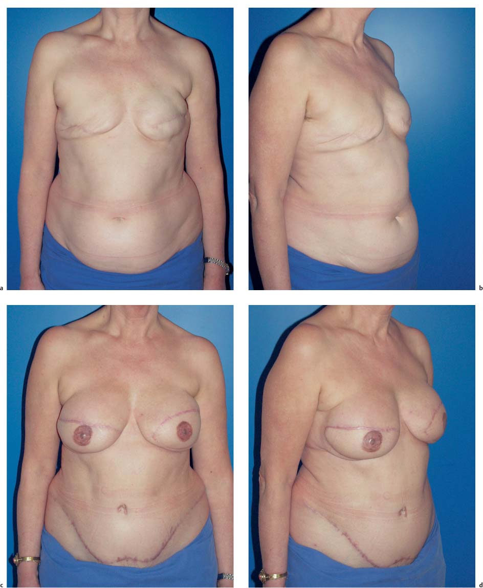 Fig. 6.64a–d Bilateral breast reconstruction in a 54-year-old woman with inadequate bilateral implant reconstruction. The patient was an ideal candidate for autologous reconstruction with lower abdominal tissue. a, b The preoperative appearance. c, d Seven months after bilateral free rectus abdominis muscle (TRAM) flap reconstruction without further correction, and 6 weeks after reconstruction of the nipple–areola complex.
