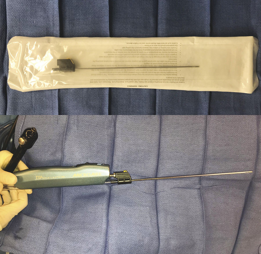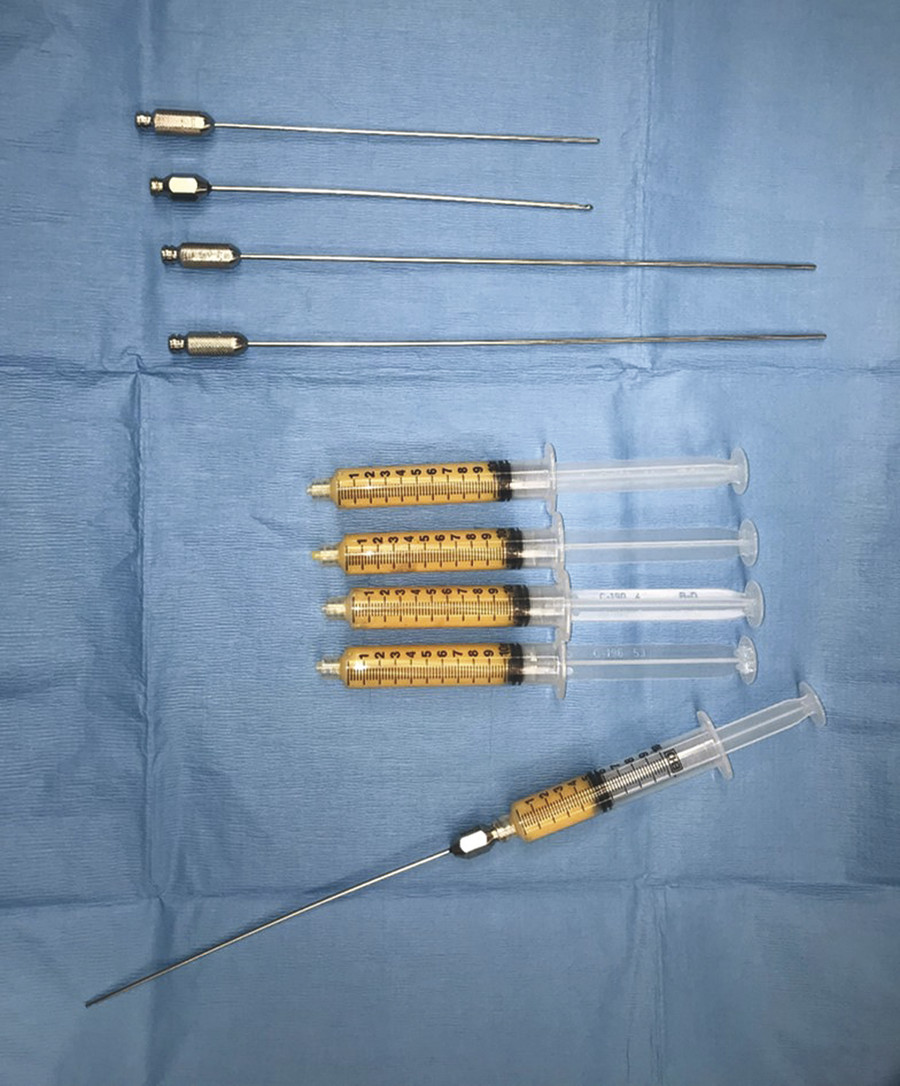 Studies suggest that use of smaller harvest cannulas, such as 2- to 4-mm cannulas, may result in less graft retention compared to larger cannulas, despite eventual use of small injection cannulas. 24 , 25 Larger harvest cannulas are thought to result in less damage to harvested fat, in part due to less shear stress. 26 Data evaluating cannula size is limited in the setting of tumescent infiltration techniques, and it is unclear whether use of wetting solutions can decrease the shear stress associated with smaller cannulas. 16 Larger cannulas, however, harvest larger fat fragments that may lead to accidental bolus injection when using smaller injection cannulas. As a result, a 3-mm cannula with multiple holes is typically used. Disposable cannulas should be used when harvesting for fat transfer (Fig. 6‑1).