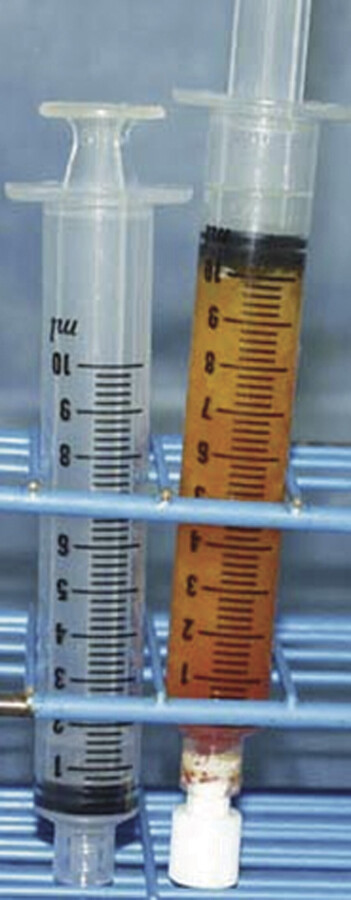 Another option is decantation, in which the adipose tissue and associated fluid are separated by gravity. This is typically performed directly in syringes, although commercial devices also exist (Fig. 6‑2). Decantation is an inexpensive and easy approach to fat processing, however, it often results in inadequate removal of fluid. Remaining infiltration fluid and adipose-secreted cytokines and enzymes can lead to decreased adipocyte viability and increased resorption. 44 Separation by cotton gauze rolling is another inexpensive approach, in which the fat is gently rolled over nonadherent gauze to remove fluid. Although this is a viable option for small-volume fat grafting, it is not practical for processing large quantities of lipoaspirate.