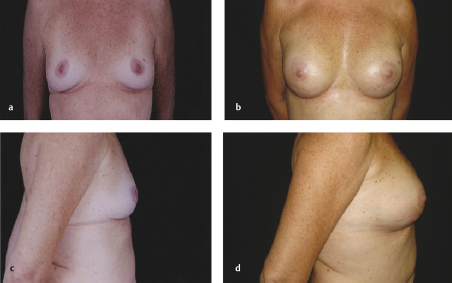 The majority of postoperative edema resolves after the first month; however, patients should be counseled that the overall volume of the breast will continue to decrease over the following months as a result of fat resorption. In a patient with stable weight, the volume typically stabilizes after 3 to 6 months postoperatively. 30 Publications vary, reporting one to five sessions of fat grafting needed to achieve desired augmentation (Fig. 6‑5). 15 , 49 Repeat fat grafting can be performed 6 months after surgery.