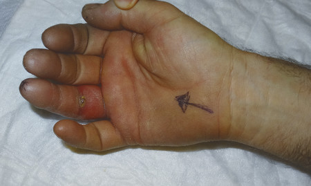 Fig. 6.1 Classical presentation of a flexor sheath infection in the ring finger. Grossly swollen digit with foreign body puncture wound.