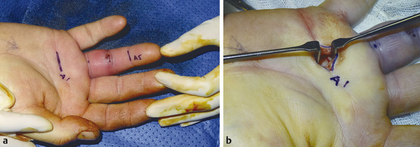 Fig. 6.2 (a,b) Markings over A1 and A5 pulley for closed irrigation technique and blunt dissection down to A1 pulley and flexor sheath.