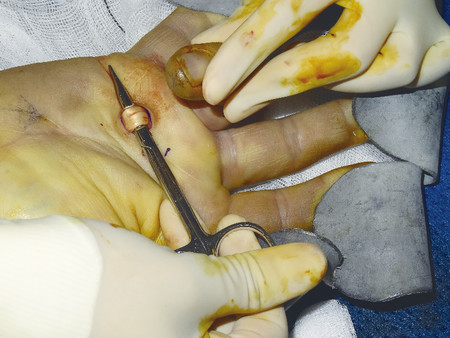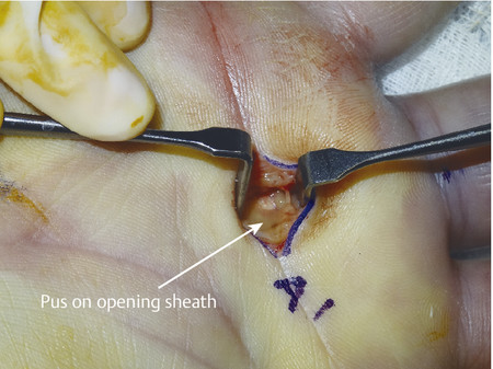 Fig. 6.3 Flexor sheath opened over A1 pulley. Pus identified and swabbed for microbiology to determine antibiotic sensitivities.