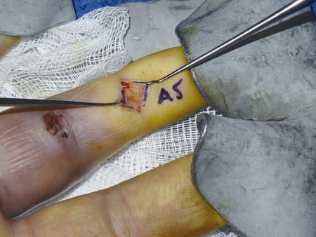 Fig. 6.4 Blunt dissection down to A5 pulley for distal access of flexor sheath, care here not to injure the digital nerves as they can be very superficial.
