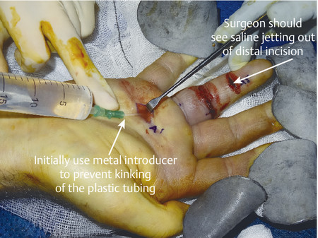 Once the flexor sheath is opened proximally, a green cannula with the metallic introducer is placed underneath the A1 pulley. The introducer maintains rigidity and prevents kinking of the plastic sheath. Sometimes due to swelling it is necessary to vent the A1 pulley to gain access. Distal access is made through the A5 pulley. If the surgeon remains midline, neurovascular structures will remain safe (Fig. 6‑2, Fig. 6‑3, Fig. 6‑4, Fig. 6‑5).