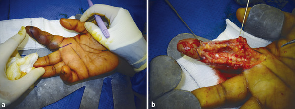 Fig. 6.7 (a,b) Midlateral open approach is warranted in cases where there is subcutaneous purulence over the entire digit.
