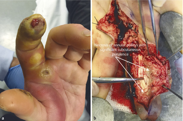 Fig. 6.8 (a,b) Similar case demonstrating severe flexor sheath infection with subcutaneous purulence. There is obliteration of the annular pulleys. A closed technique would not address the infection.