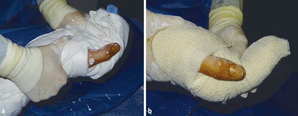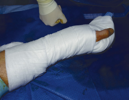 Wounds should be left open and dressed with Betadine-soaked gauze over Jelonet and a plaster of Paris in the position of safe immobilization (Fig. 6‑9, Fig. 6‑10). The injured hand should be placed in a high-arm sling to reduce edema.