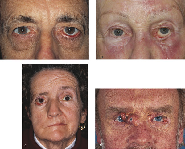 Fig. 6.1 (a) A left lower eyelid involutional ectropion. (b) A left lower eyelid cicatricial ectropion. (c) A right lower eyelid paralytic ectropion in a patient with a right lower motor neuron facial palsy. (d) A left lower eyelid mechanical ectropion in a patient with multiple periocular xanthomata.