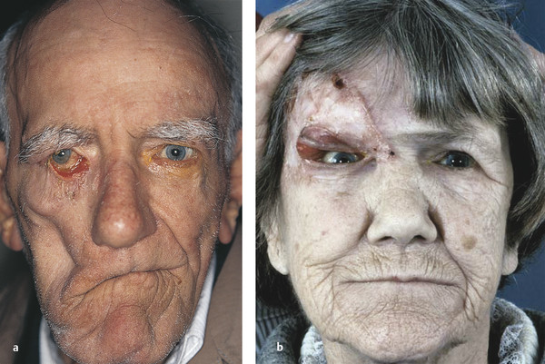 Fig. 6.2 (a) A right lower eyelid ectropion in a patient with a chronic lower motor neuron facial palsy. In this patient all the etiological factors coexist and should be addressed in his management. (b) A right upper eyelid ectropion caused by severe scarring after herpes zoster ophthalmicus.