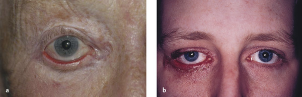 Fig. 6.4 (a) Inferior punctal eversion affecting the right lower eyelid. (b) A patient with a bilateral complete tarsal ectropion with keratinization of the chronically exposed conjunctiva.