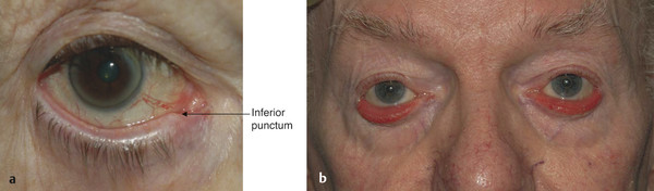 The initial sign of a lower lid ectropion is inferior punctal eversion (Fig. 6‑4a). This can lead to a vicious cycle of secondary events and needs to be addressed early. Eversion of the inferior punctum leads to exposure and drying of the punctum, which becomes stenosed. Epiphora ensues, which may lead to excoriation and contracture of the skin of the lower eyelid that further exacerbates the ectropion. In addition, the patient tends to continually wipe the tears from the lower eyelid, which in turn results in eyelid and medial canthal tendon laxity that further exacerbates the lower eyelid ectropion. If the condition is neglected, the tarsal conjunctiva becomes exposed and eventually thickened and keratinized (Fig. 6‑4b). Lower lid ectropion often results in a corneal epitheliopathy, especially in the inferior third of the cornea.