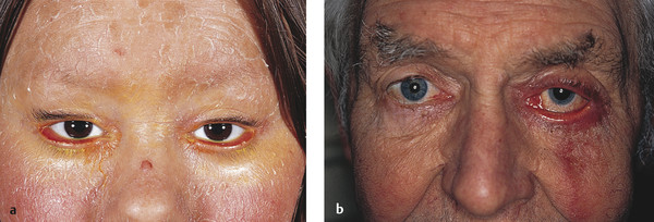 The patient’s history may point to a number of dermatological disorders that may be responsible for a cicatricial ectropion, such as eczema, lamellar ichthyosis, contact or allergic dermatitis (Fig. 6‑5a). A drug history may reveal topical medications the patient may be taking to which there may be an allergy with a secondary chronic dermatitis, such as topical glaucoma medications (Fig. 6‑5b). This is not an uncommon cause of lower lid ectropion in elderly patients attending glaucoma clinics and is often overlooked or misdiagnosed.
