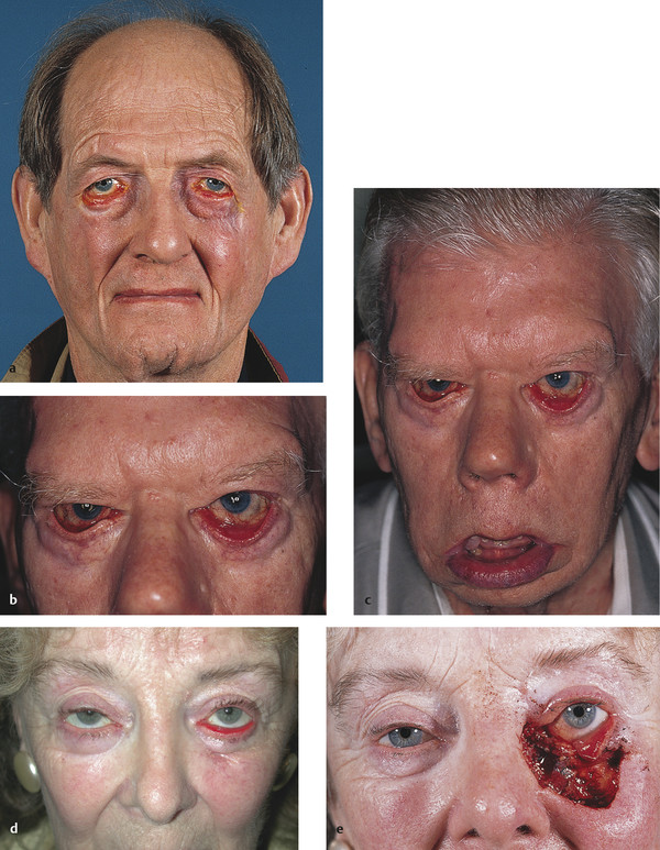Fig. 6.7 (a) A patient with a bilateral lower eyelid ectropion. The patient has Ehlers–Danlos syndrome. (b) A patient with a severe bilateral lower eyelid ectropion. He also has a bilateral brow ptosis. (c) An examination of his whole face reveals a severe bilateral lower facial weakness. He also had a bilateral abduction weakness of both eyes. The patient has Möbius syndrome. (d) This patient’s left lower eyelid ectropion was caused by a lower eyelid morpheic basal cell carcinoma. (e) The patient’s appearance after a Mohs’ micrographic surgical excision of the tumor.