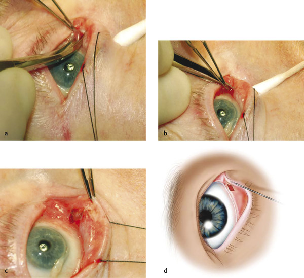 3. The conjunctiva is lifted just below the inferior punctum using Paufique forceps. A diamond-shaped excision of conjunctiva is performed using Westcott scissors. A cut is made through the tented conjunctiva in a horizontal plane medial and then lateral to the forceps, creating a diamond-shaped excision (Fig. 6‑12a–d).