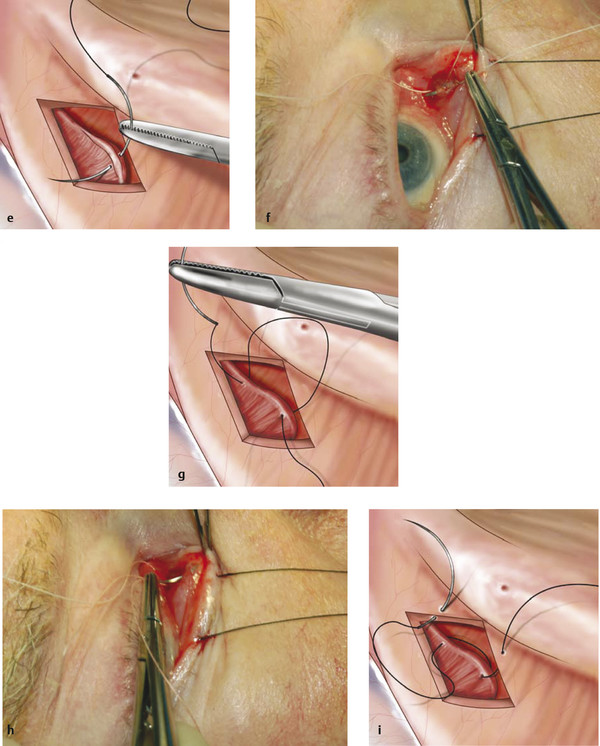 Fig. 6.12 (e–g) The double-armed 5–0 Vicryl suture is passed through the eyelid retractors. (h,i) The needle is reversed and passed through the superior edges of the diamond-shaped conjunctival wound.