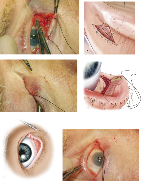 Fig. 6.12 (Continued) (j,k) The needle is kept reversed and passed through the inferior edges of the diamond-shaped conjunctival wound. (l,m) The sutures are brought out through the skin at the lid–cheek junction. (n,o) The suture is pulled until the diamond is closed and the punctum is brought back into contact with the lacus lacrimalis.