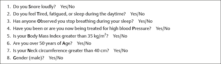 STOP-BANG questionnaire most commonly used and recommended in SAMBA (2014) Consensus Statement on OSA and Ambulatory Surgery 17 (Fig. 6-1)