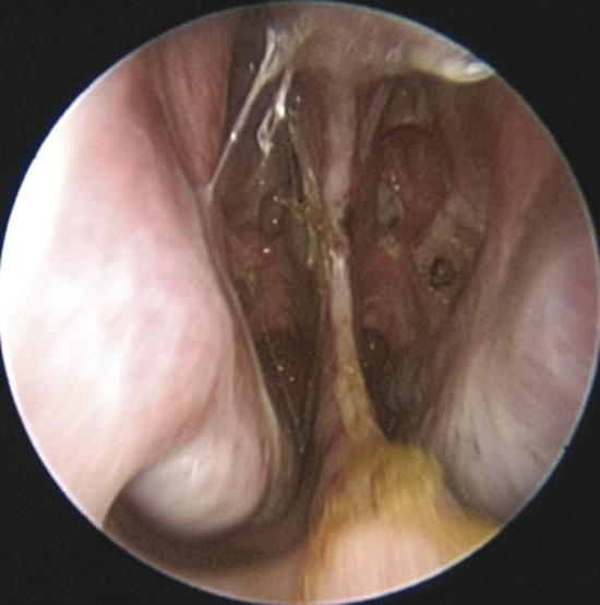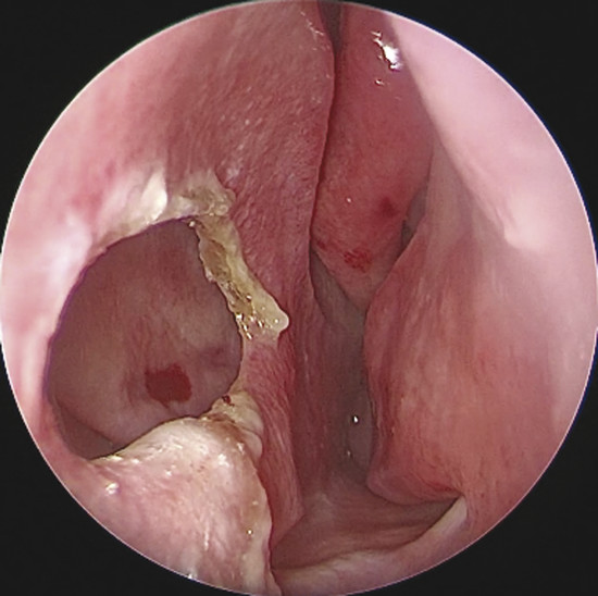 The physical examination starts with inspection of the nasal pyramid for any alterations regarding the structural deficit. Indeed, large NSP can result in loss of support of the nasal dorsum and consequent “saddle nose,” sometimes associated with a deviation of the caudal edge of the septum. The nasal endoscopy with rigid fiber optics (30 degrees) is a key step of the physical examination. The use of topical decongestants and local anesthetics can make it easier and tolerable, especially in cases where the removal of crusts by an underlying mucosa, easily bleeding areas, or a biopsy is expected.