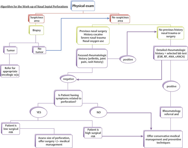 Batniji in 2012 proposed an algorithm for the preoperative evaluation of the septal perforation, 5 which is shown in the flow chart in (Fig. 6‑7)