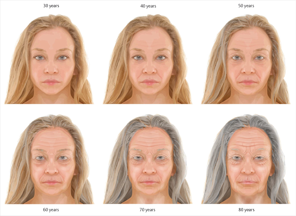 Aging skin results from deterioration of the skin’s structure and function and is associated with changes in the epidermis, dermis, and subcutaneous layers. Factors contributing to the appearance of aged skin include dry and thin skin, a dull and rough complexion, enlarged pores, irregular pigmentation, actinic keratosis, loss of firmness and elasticity, broken blood vessels, fine lines, and deep wrinkles. There are three main types of aging responsible for the change in the structure, function, and quality of the skin.