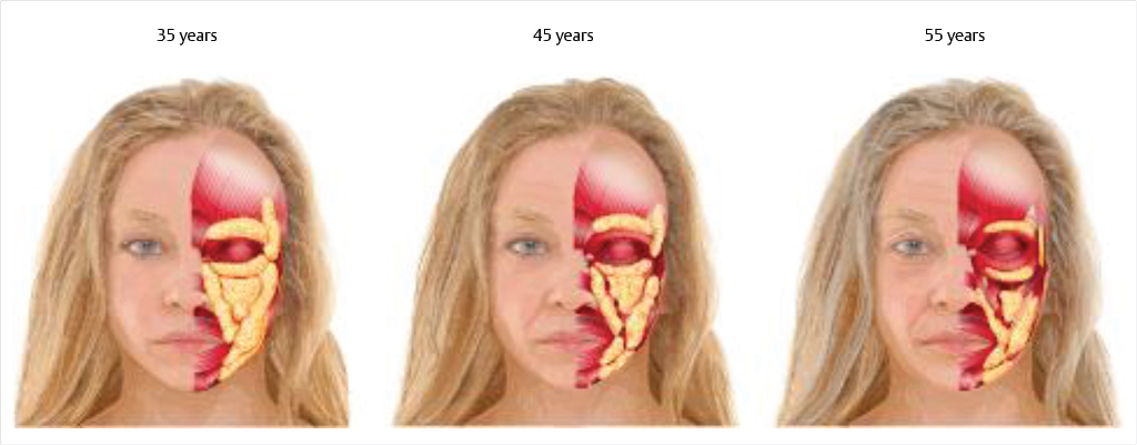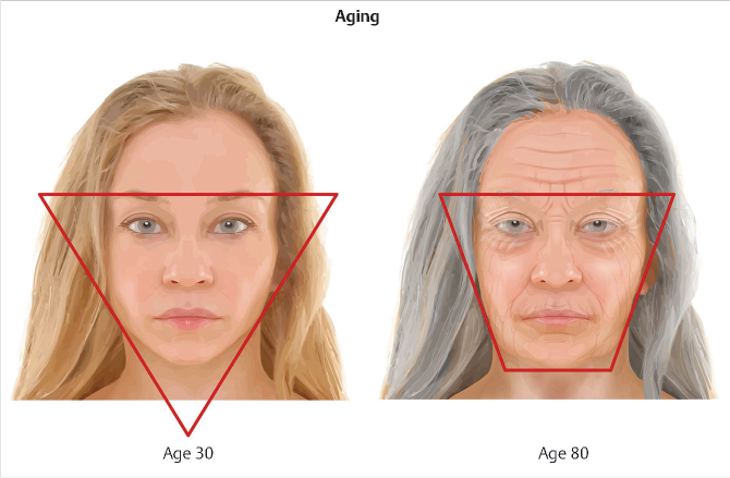Facial aging reflects the cumulative, dynamic, and interdependent structural changes of the skin, soft tissues (subcutaneous fat, muscle, fascia, and ligamentous structures), and structural support (bone and teeth) of the face, leading to changes in facial volume and topography (Fig. 6‑2). 31 There is a general descent of the soft tissues with age, which has been described by an inverted triangle (Fig. 6‑3).