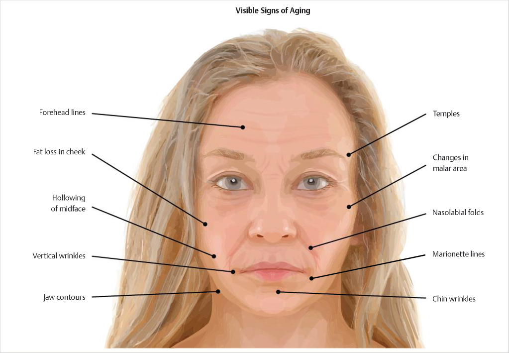 Fig. 6.4 Signs of facial aging include greater visibility of lines and wrinkles (such as in the forehead); nasolabial folds become prominent; there is volume loss in the temples and midface; contours of the jaw change from fat redistribution and changes to the underlying craniofacial skeletal. Many factors contribute to aging of the skin.